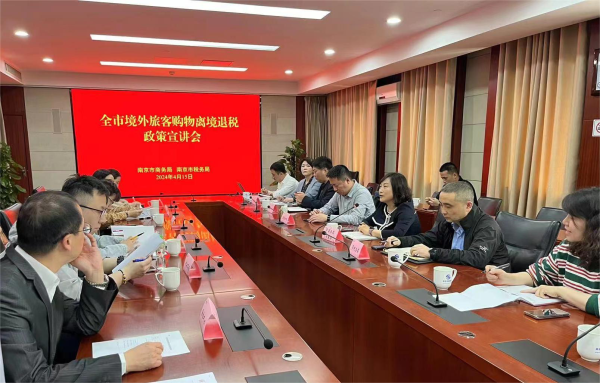 4月15日下午,市商务局会同市税务局联合举办境外旅客购物离境退税“即买即退”服务宣讲会,秦淮区商务局和新百商店、中央商场、新街口金鹰、建邺金鹰、仙林金鹰、国金中心等商户参会。