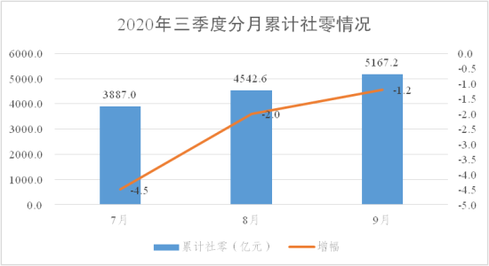 1—9月,累计实现社会消费品零售总额5167.2亿元,下降1.2%,增速分别高于全国、全省6和3.5个百分点。累计实现销售总额15659.8亿元,增长0.3%,年内首次由负转正,较上半年回升5.3个百分点。