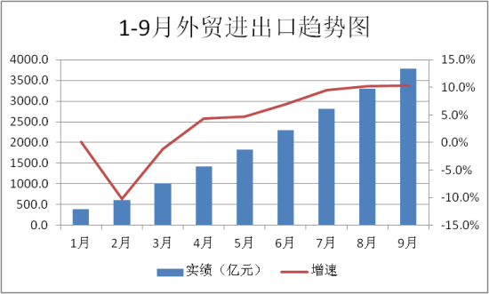 1—9月,全市累计进出口3788.6亿元,增长10.3%,增幅分别高于全国、全省9.6和9.5个百分点。其中,出口2360.6亿元,增长13.1%;进口1428.1亿元,增长6%。