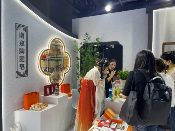 南京正官庄电子商务有限公司(南京牌肥皂)展位上,精心布置了一幅《南都繁会景物图卷》上的局部画面。这幅被称为明代南京版《清明上河图》的画卷,展现了当时南京繁华的商贸图景,图上其中有一个店铺当时就在卖肥皂。企业相关负责人黄勇介绍,本届进博会,企业带来了雨花石肥皂、与十竹斋联名的四季香氛皂、融云锦纹样和金箔元素于一体的“金箔蚕丝皂”等一批创意肥皂,通过跨界联名等方式,将南京文化元素与日化消费品巧妙结合,向世界展示老字号的新风采。