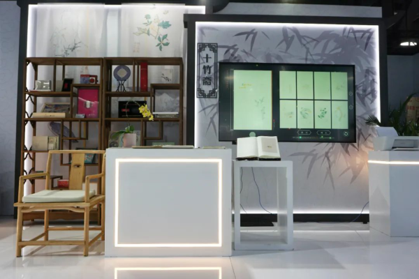 手指点点屏幕,选择具有东方美感的元素、对应的诗句等,就可以定制属于自己的笺谱,还能现场打印带回家。十竹斋推出的“数字化笺谱”互动展示,成为江苏展台一大亮点。只见大屏之上,原本的静态笺谱成为灵动翩跹的动态图样,还伴有经典故事解读,妙趣横生。